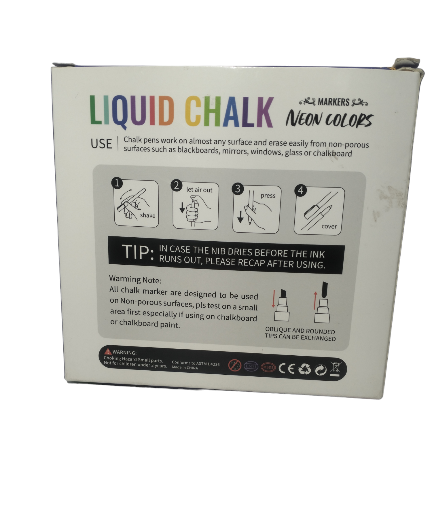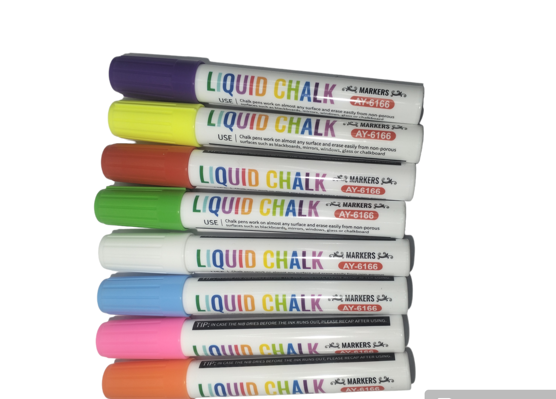 LIQUID CHALK NEON COLORS Chalk pens work on almost any surface and erase easily from non-porous surfaces such as blackboards, mirrors, windows, glass or chalkboard |